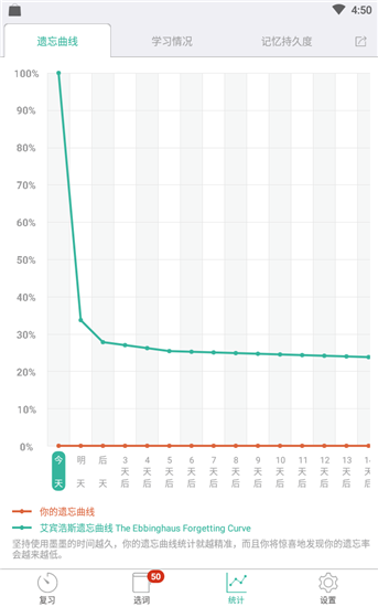1. 你的遗忘曲线:真实反映了你在每个阶段对所学习单词的遗忘率;