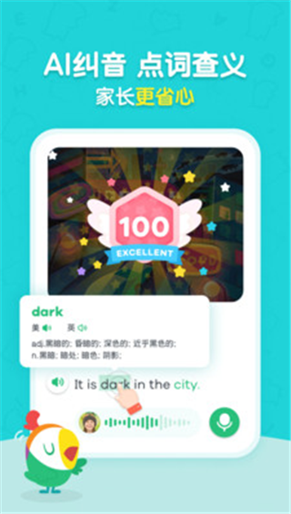 纯正英文发音输入,跟读智能反馈,及时纠正错词发音,让孩子练就地道口语发音,成为听读小能手。