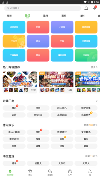 2、点击分类标签,会有各种不同游戏的类型,大家可以根据兴趣爱好下载;