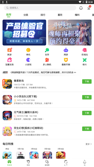 1、打开4399游戏盒app首页,会出现推荐板块,都是时下热门游戏;