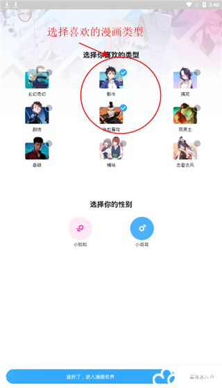 1、首次打开哔哩哔哩漫画app,可以选择自己喜欢的漫画类型,以及你是小哥哥还是小姐姐;