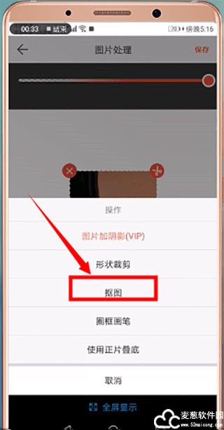 3、点击底部【裁图】,选择一张要抠图的图片,点击右上角确定;