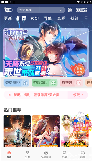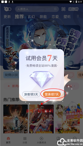 1、打开飒漫画app,首页可以领取超值福利,游客领3天,注册登录领7天免费会员;