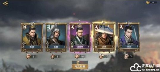 用完10连抽,第一次五连会随机出一个神将(大概率是输出型),剩下4个蓝将紫将随机。