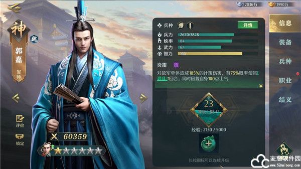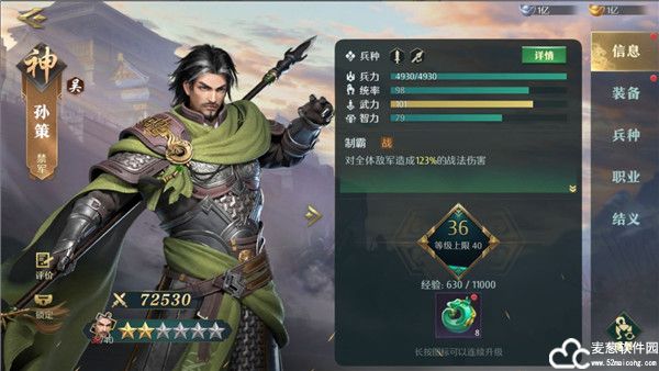 0星技能效果:卧龙吟2腾讯版中孙策能够对全体敌军造成115%的战法伤害