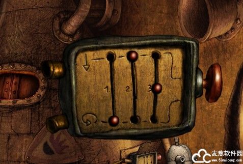 3、上楼梯拉一下拉杆,可以看到一辆矿车出来,出口的门打开才会让矿车通过,下楼梯,发现可以用扶手去勾拉杆,不过短了一点点。拉杆下方有小半截断掉的铁钩,把铁钩安在楼梯扶手上,这样就可以在楼梯下面拉动开关了,可是人还是没那么快速度跟着矿车一起出去,这时候发现了画面右上方有个像菜刀状的物体勾在大铁桶上,怎么拿呢?先来到铁轨旁的圆锥性铁箱处,蹲下身(鼠标点机器人身上向下拉),然后点右方的仪表,把仪表打到2和A,然后按下小红纽开关,上楼梯拉长身体,跳到上面的杆子上,去拿那个物品,将金色的物品放在铁轨上(注意位置,放到右边那根铁轨上),然后推楼梯的扶手,结果矿车翻了,拿下矿车的车轮子,坐上去后再拉一下楼梯的扶手,过关。