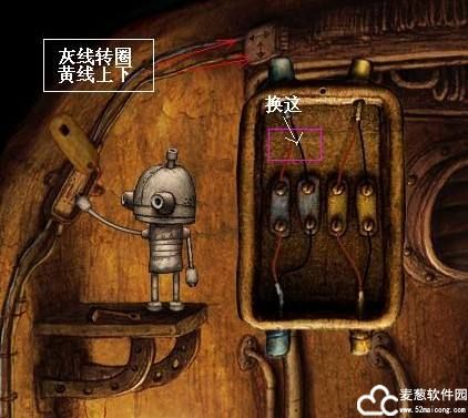 这时爪子开始运作,迅速把身子拉回原样跑到矿车处,跳上矿车。爪子抓到你之后你把鼠标移动到左方的平台时会出现向左的鼠标,那时候点一下就可以跳上平台了。然后用先前拿到的钥匙打开控线盒子,观察一下线路可知道,左边的灰色线路控制转圈,右边的黄色线路控制上下。