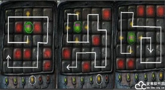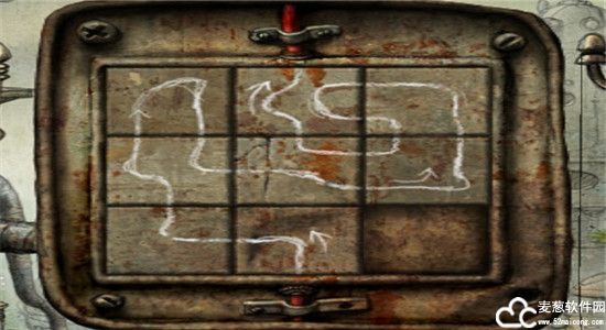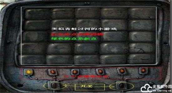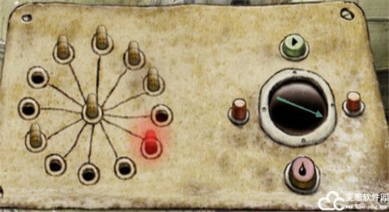 11、进到一个温室里,下来可以拿到身后的两个抽屉,将抽屉拿走,室内有两台机器,右边的机器类似幻灯机,这台机器都连接着画面最右下角的一个配电盒,点击配电盒,又是个小游戏。这个小游戏的规则就像是青蛙过河,你可以一开始设定一个起点,然后走完全部的格子才算完成.但是又不像青蛙过河那样可以让你一步步的走,这里只能让你选择一个方向,然后电脑帮你走到这个方向的尽头。