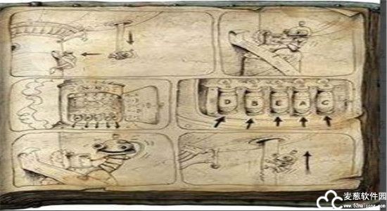 4、刚一出来,就发现一个胖子机器人来偷吃碳,吃完了一车就从一个窗口走了。先到画面右方下面锁着的门旁边拿到勾在墙上的钥匙,再来到画面中间的锅炉处,点一下那个会闪的小红灯,右边的开关就打开了,然后点一下开关,这个开关有三个,三个开关表示锅炉上方爪子的三次动作,把开关拉到上方表示爪子会下落抓东西,把开关拉到下方,表示爪子会循环一圈,把开关放在中间,爪子不会工作.现在我们把第一个开关设定为转圈,就是拉下来,这个表示爪子会循环一圈,第二个设定为抓东西,就是把第二个开关拉上去,第三个开关又是转圈。这样的排列就是开关1拉到下方,开关2拉到最上方,开关3拉到下方(图示),设定好了之后按下右方的红钮开关。
