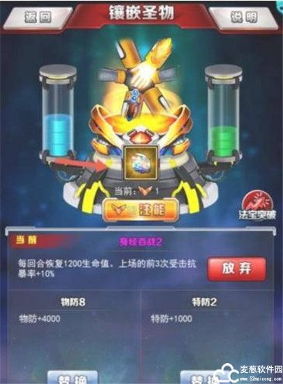 2、然后把圣物镶嵌一下,每回合恢复1200生命值,前三次受击抗暴率 10%。