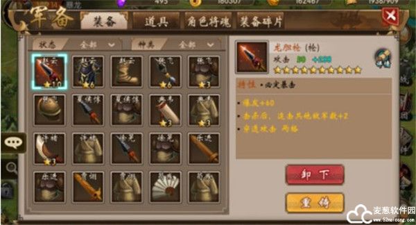 注意:装备上方标注了武将名字的,为已经被武将装备的,所以不能进行“出售”、“分解”、操作。