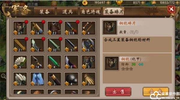 装备碎片界面可以对已经收集到的装备碎片进行“合成”、“出售”操作