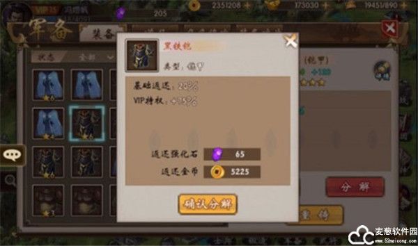 分解装备会返还一部分强化装备时花费的铜币和强化石。