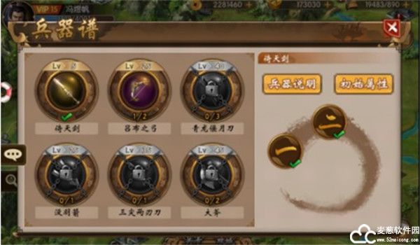 可以看到兵器谱中罗列出了所有神器,每一把装备都有着对应的三国名将,而名器谱关卡也是该名将的历史小故事,这些关卡都有一定的挑战性哦。