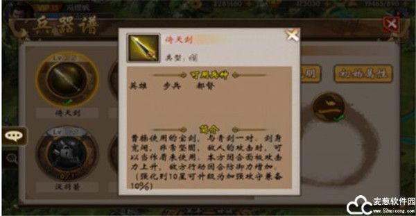 点击解锁的兵器即可以看到有关兵器的说明和其初始属性,目前一开始自动解锁的兵器只有“倚天剑”(根据游戏开始选择的武将不同自动解锁的神器也不同,曹操-倚天剑,刘备-雌雄双股剑,孙坚-古锭刀),所以我们这里就拿最简单的“倚天剑”来举例吧!
