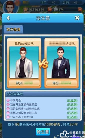 第一,在选择抢生意的对象时,有两个数据非常关键,一是双方团队谈判能力的整体评分对比,二是获胜后玩家商铺可以分得的客流量。对于前者来说,如果双方实力对比太悬殊,我们获胜的机率就比较低了,但是如果对方的评分集中在角色身上,员工的评分都很一般,那么基于以多取胜的原则,我们还是有可能取胜的;对于后者来说,由于抢生意成功之后会有冷却时间,如果分得的客流量太少,我们可以考虑选择更好的对象发动进攻。