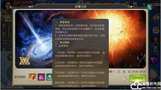 龙魂斗法是游戏中一个多人混战pk玩法,在每周一、三、五、日晚8点开始。进入后会被分配阵营,阵营双方都有一名领袖。击杀敌对阵营的玩家或领袖都可以获得龙魂积分,每达到一定的积分即可领取符文礼包和灵骑经验丹。