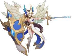 背景故事:神界的守护神,神域的看守者,她用破晓之盾和斩神剑守护着神界的安宁,犹如不灭的太阳,只有往无休止的战斗,才能满足他对胜利的渴望。强壮的体魄是她凯旋的资本。在战斗中他负责冲锋陷阵,当队友深陷窘困时,他只需仰天怒吼,便一人担起所有攻势
