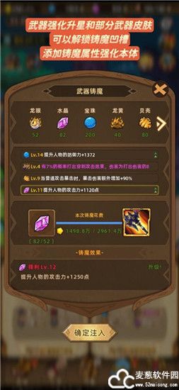 除了花费金币强化武器以外,我们还可以将铸魔材料注入到武器的铸魔槽中,为武器带来强大的铸魔效果。目前游戏中共有14种铸魔材料,各位可以通过试炼洞窟派遣、魔塔战斗宝箱、幻境寻宝、许愿池抽奖、牧场精灵收益、精英幻塔挑战等多个途径获取。武器每强化9级,即可提升1级武器星级。铸魔槽主要通过提升武器星级、获取部分武器皮肤增加。