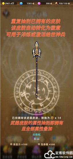 武器皮肤共分为原始、稀有、极品、史诗、绝世神兵5种品质,从史诗开始会出现更高级的词条(伤害穿透、精灵技能伤害、攻速等),稀有度最高的绝世神兵武器皮肤还可附加如群体攻击等被动能力。