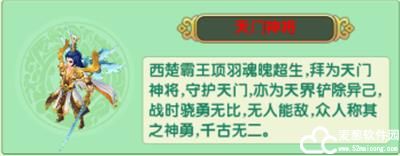 西楚霸王项羽魂魄超生,拜为天门神将,守护天门,亦为天界铲除异己,战时骁勇无比,无人能敌,众人称其之神勇,千古无二。