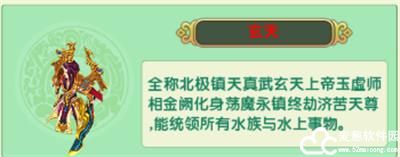 全称北极镇天真武玄天上帝玉虚师相金厥化身荡魔永镇终劫济苦天尊,能统领所有水族与水上事物。