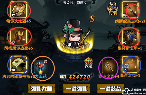 红色标注的是“装备”,装备分四个,分别是武器、头盔、胸甲、战靴。可以进行“强化”、“精炼”、“进阶”。