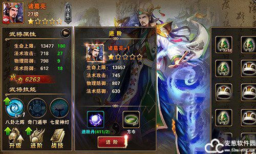 消耗特定品质类型的装备,提升武将的属性值。每个武将需要进阶两个小阶段才能开始进阶下一个大阶段。