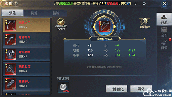 一键强化:将优先升级强化等级最低的装备,直至消耗完所有强化材料。