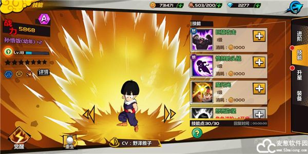技能效果:孙悟饭幻化成巨猿,攻击当前目标及后排对位目标造成(伤害力*765%+固定伤害)点物理伤害,本次和之后的怒气技提高10%攻击力,该效果最多叠加三次。