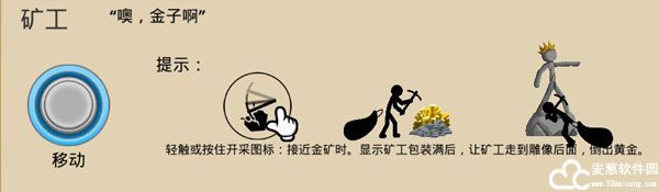 1、矿工:轻触或按住开采图标:接近金矿时。显示矿工包装满后,让矿工走到雕像后面,倒出黄金,完成收集。
