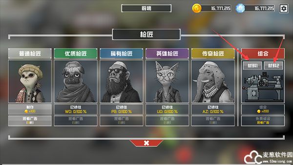 1、在枪匠界面中点击【材料1】【材料2】按钮放入材料枪