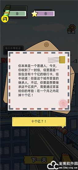 2、你本来是一个普通人,今天,你收到了一封信,信里面是一张包含有十个亿的银行卡,信中说道:你是这个城市首富的继承人,不过,你要是想要继承这千亿资产,需要通过首富给你的考验:在一个月之内花掉十个亿!