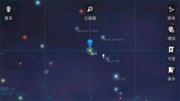 2、跃迁点击左上角 星系 ,移动中心点选择目标星系,再点右上角 路线 就能定义跃迁线路,选择飞船曲率跃迁,就能到下一个星系(可以升级 曲率驱动器 增加跃迁的距离)( 飞船在 曲率驱动器 的 最佳质量 内 燃料仓 越大,跃迁距离越远,也就是越贵越好用)