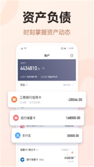 4. 资产负债:账户支持储蓄卡、信用卡、花呗、理财账户等管理,钱在哪儿门儿清