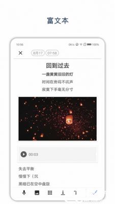 软件采用了时间戳的方式进行记事,让用户可以在每个时间段添加自己的事件内容,这样在以后的某个时间内就可以知道那个时候做的工作、学习、生活等内容。它致力让用户可以更好的记录自己的生活。软件为用户提供了优质的记录体验,记录文字的同时还能选择自己的心情,添加标签;而且还能通过它记录语音和图片,非常的方便。而且还有各种小组件可以添加,这样就可以记录自己账单、运动、身体数据等,一款软件多项用途。文本支持字体加粗,标题,居中,列表,图片备注等格式,图文混排,支持插入图片,语音,事件;边写边保存,即使遇到异常情况也不会丢失内容;勾选完成即可后台自动同步,无需等待,差量更新,节省流量;一篇日记可添加多个标签,既可用于分类,又可快速搜索。