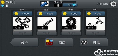 2、升级发动机时会发出真正涡轮的声音!趣味平衡类游戏,游戏全程就是一位面无表情的大叔开着销魂的红色汽车在各种崎岖的路上前行。