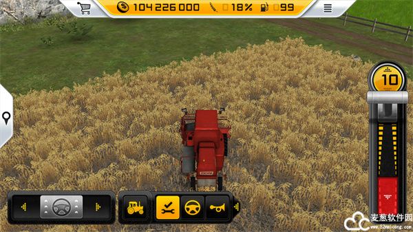 2、但如果你觉得自己的开车技术实在烂的话,小编这里可以教大家一个方法:先把收割机开到小麦附近,然后点击屏幕下方的“方向盘按钮”,这样收割机会自动收割小麦。