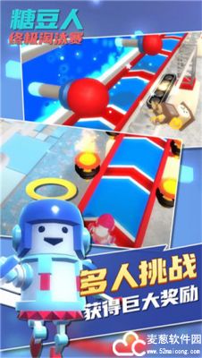 4、障碍狂欢:比较简单的竞速,避开障碍物到达终点,障碍物有:独木桥,旋转门,摆锤,粘液斜坡,糖葫芦。这关值得一提的是开始时如果你在后排挤不上独木桥可以直接往下跳从下面走的速度一点也不差的,粘液滑坡走边缘。