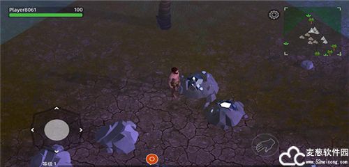 2、如果想要快速升级,看看附近有没有恐龙可以猎杀,那么我推荐大家到家附近去挖矿,点击屏幕右下方的背包按钮,将刚刚制作的石镐拿到手中,然后对准石头或者矿物。