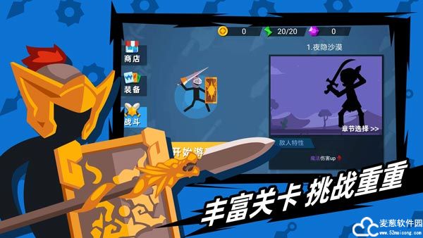 1、火柴人神射手游戏装备有四个:武器,盾牌,头盔,披风。武器增加玩家的攻击力,盾牌抵挡正面伤害,头盔抵挡上方的伤害,披风增加生命值。