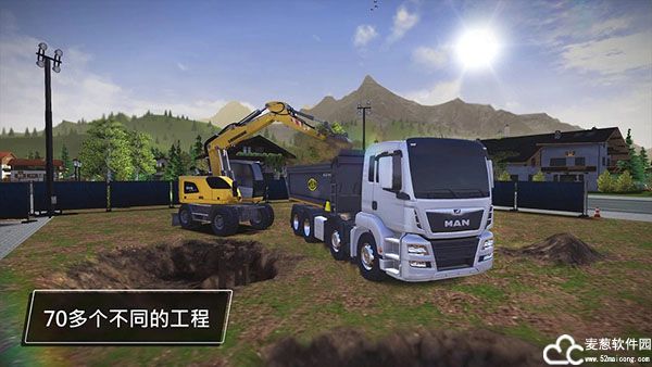 3、玩家们可以驾驶14个品牌、超过50种建筑机械,比如德国曼集团MAN、卡特彼勒CAT等知名工程机械公司旗下的各种车辆,还可以完成70多个订单任务。
