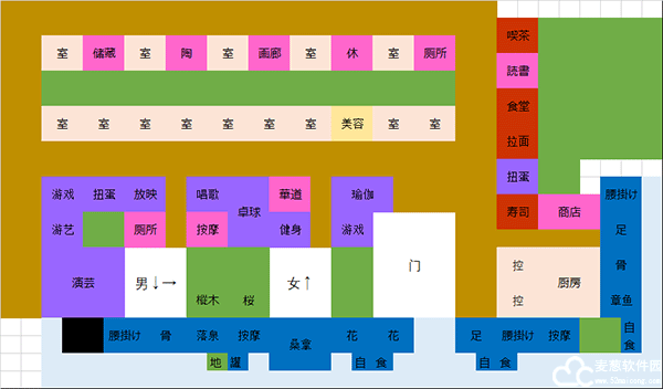 2、布局图上半部分的中间是“商业区”,每种设施只用一个,实现所有的契合度组合。没有契合度组合的设施也放置在了这里。两边是男女温泉区,放置了所有四种温泉,并且实现了每个温泉都有除了异性加成之外的六种温泉功效(例如男性的温泉没有花瓣之池和盐之池这俩增加女性契合度的功效)。