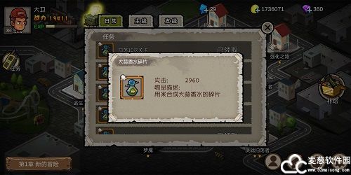 1、每日任务获得大蒜香水碎片:玩家每天可以通过日常任务获得23个大蒜香水碎片,50个碎片合成大蒜香水饰品,这个饰品是玩家重要的攻击力来源,如果玩家前期卡关特别严重,只要把日常任务做好,把大蒜香水合出来就能顺利打到2-7。