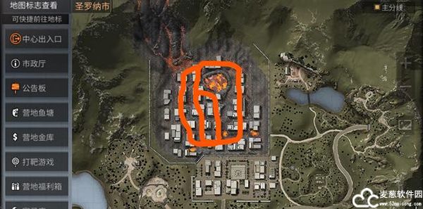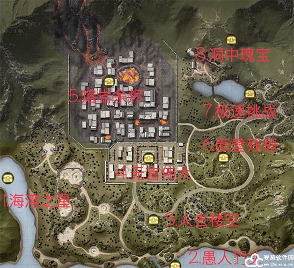 是这个地图最难找的箱子,随机刷新的范围比较广,很需要耐心。刷新在地图中间的被岩浆侵蚀的城市区中的屋顶上,具体是哪些房子的房顶,小编已经为小伙伴们标出来了,详见下图。