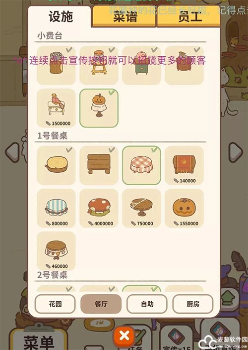 ●用获得的小鱼干和星星来购买餐厅设施,餐厅设施越多来的客人就会越多。