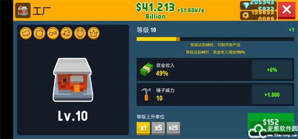 升级工厂:工厂升级能带动资金收入的增长和锤子威力的增加。