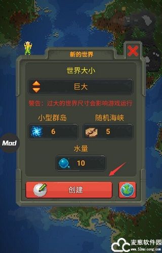 2、然后创建一个世界,选择创建好的世界大小,设置好群岛还有海峡,当然你也可以默认,然后点击创建
