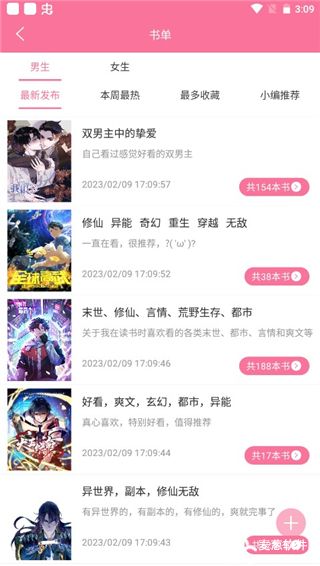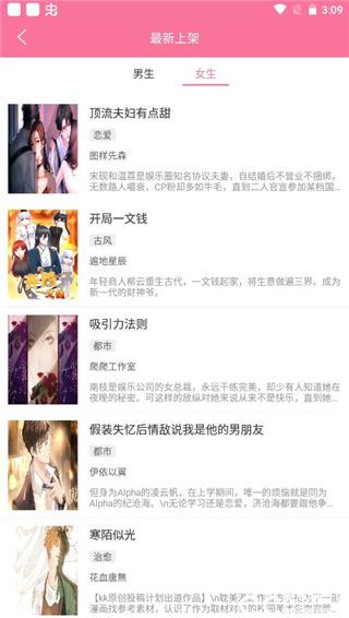 3、最新上架,分为男生榜、女生榜,时下最新资源第一时间上架,永远不错过精彩;