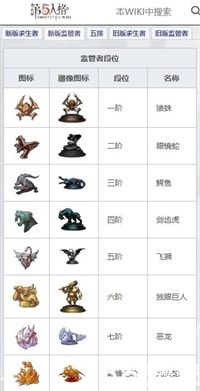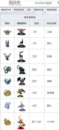 求生者的段位顺序分别为一阶、二阶、三阶、四阶、五阶、六阶、七阶和巅峰七阶,标志名称分别是:工蜂、猎犬、驼鹿、猛犸、狮鹫、独角兽、勇士和大力神。